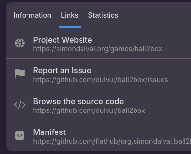 | Summary | 0017273: The flathub page is missing the "Report an issue" and "Browse the source code" links | ||||