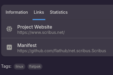 | Description | https://flathub.org/apps/net.scribus.Scribus doesn't have the issues and source code buttons in the links section. | ||||