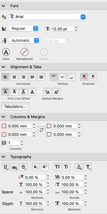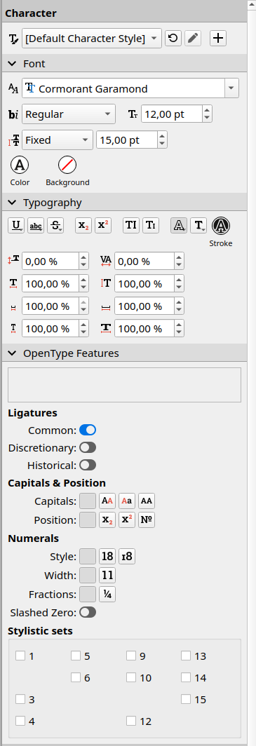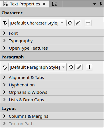 | Description | A huge rework of the text properties panel is done. See screenshots. What's new? - 51 new icons (incl. some refinements of old ones) - 21 new previews for OpenType font features - Text panel has been divided into 3 areas (character, paragraph and layout) - Color selection is now also done via a round color button like in the Frame Properties panel - Paragraph and character styles can now be edited and created directly - Line styles can also be edited and created directly - The Hyphenation section has been expanded to include 2 buttons to enable or disable hyphenation in the text. The language selection for the text is also located there - First Line Offset & Optical Margins have been moved to Alignment & Tabs - Advanced Settings have been merged with the Text Effects in a new Typography section - The Style Manager (Character Styles + Paragraph Styles) has been largely aligned with the changes in the Text Properties panel (but still needs another iteration). This patch has some overlaps with this patch https://bugs.scribus.net/view.php?id=17283 PS: the patch file includes only modified files. New ones and all assets are in the zip file. PPS: the patch has over 18k lines of code. Most of the changes are related to the ui files. | ||||