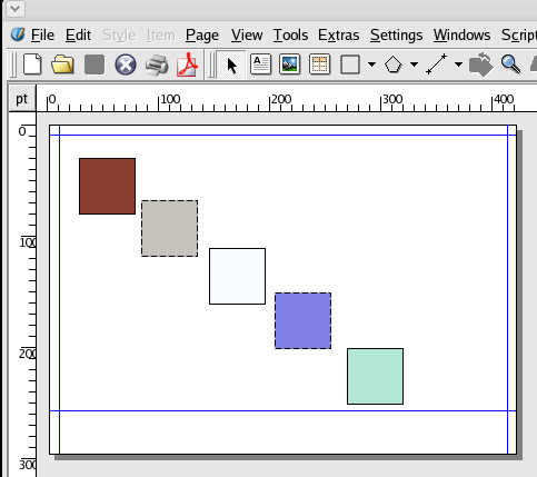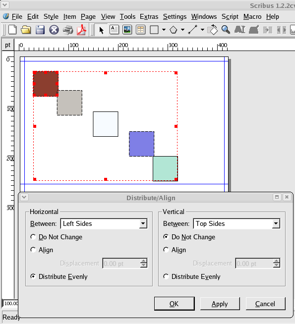 | Steps To Reproduce | - Open either of the two documents attached, or create your own with a small set of objects (for the purpose of this example, five squares). - Select all the objects on the page - Item->Distribute/Align - Leave one axis on 'leave unchanged' and set the other to 'distribute evenly'. In this example I've left the vertical axis unchanged. - Press 'Apply' or 'OK' (I used Apply) - Note that the objects have been redistributed, but certainly not such that the space between them or distance between their centres/edges is distributed evenly. Two sample documents are attached. For the 'spaced' case, before/after screenshots are included. | ||||