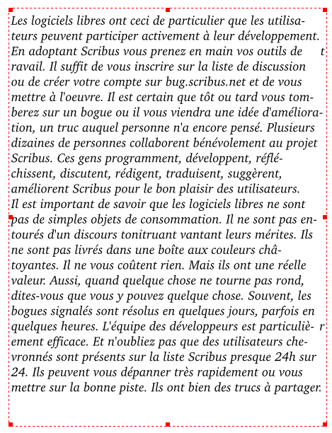 Well... Finally found a workaround to this issue. Issue seems clearly related to hyphenation. I have no other clue so far. I am ready to investigate further if necessary. Please let me know what the plans are. I can also reaffirm it's *v e r y* annoying. I'm putting the last touch to a tight 12 pages of additionnal documentation on Scribus for my workshop at AQUOPS and this caused me problems, more than once. Overall quality control and proofreading are complicated. Quite unproductive imo. Workaround: 1. Open the Story Editor and select the word that has overlapping letters. 2. Retype this word (beware of typos...). 3. If it's a long word, retype only a portion of it, where letters overlap. Try to at least grab a hyphen, even if you don't see it. 4. Repeat for all instances in each text frame where the problem occurs. 5. Update text and leave the Story Editor. Warning!: Beware of other instances that can occur consequently (it happens)! This operation will take away the hyphens (the hyphens are of course invisible when not needed, still, they are there) that cause the problem. Of course, you might as well end up with a few holes in your type which will affect the overall "typographic gray". But at least your readers will be able to follow. And it's always possible to add a discretionary hyphen manually using CTRL + hyphen (-). |