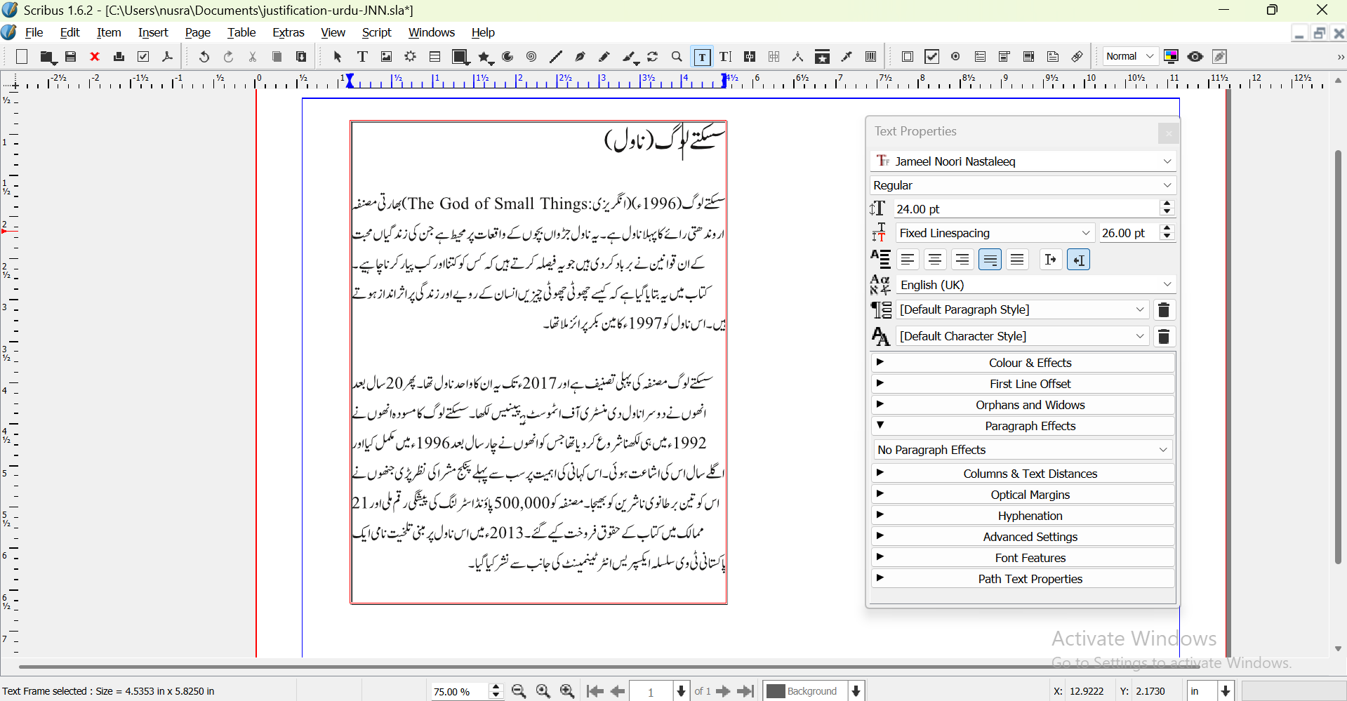 | Description | Jameel Noori Nastaleeq font (https://fonts.urdugah.com/jameel-noori-nastaleeq-regular/) is the most popular font for Urdu, justification works in libreoffice, ms word. Also, right and left align work fine in Scribuss, But when I try justification or forced justification in Scribus, it does not work. | ||||