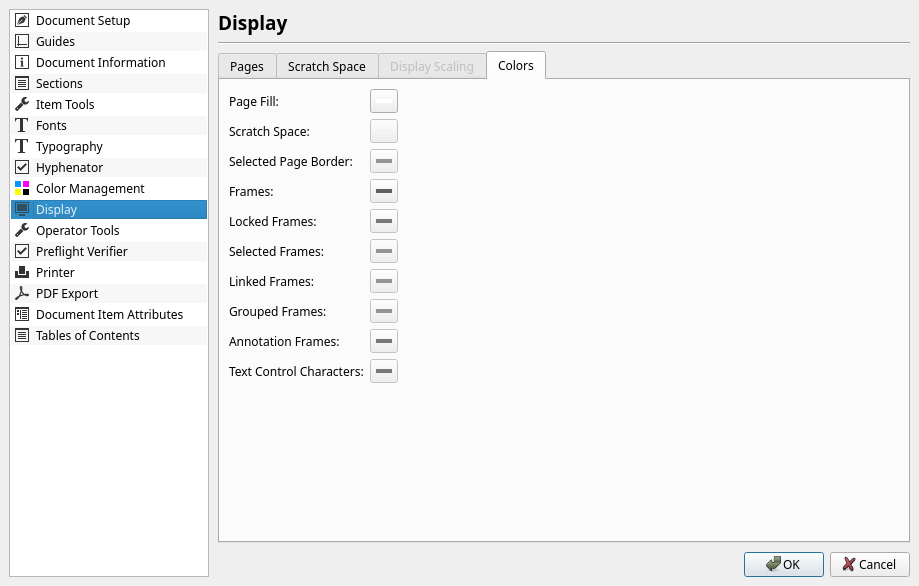 | Description | In "Document Settings > Display > Colors", all options are disabled. And the colors shown do not seem to match the ones actually used by Scribus. I've checked, and the issue seems to already be there in Scribus 1.6. | ||||