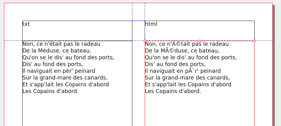 indeed<!doctype html> <html lang=en> <head> <meta charset=utf-8> <title>blah</title> </head> <body> gets imported correctly. the question is, if scribus can assume that an html file imported into scribus is so nicely created. htmlSAXParseFile() accepts as second argument the encoding. it's not clear to me, if that's an hint that will be overridden by an existing encoding defined in the document or if its the final encoding. i've went through the libxml code and, sadly, it looks like "encoding" will win. i'm using insertHtmlText() for the first time, and it seems not to do what the name says (it can load text in any supported format, not only html) and it does not provide an interface that can process html text that is likely to be feed to it (as an example html snippets). i would like to suggest that we deprecate it, and create a set of functions that can be used on "real" data. |