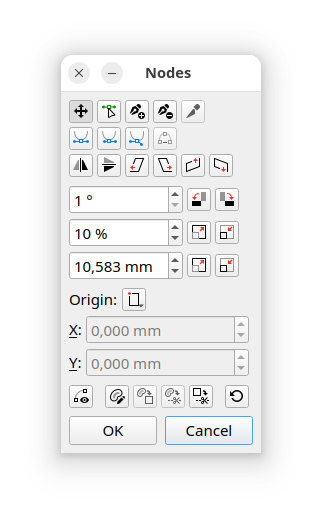 - adding the DEL key for deleting a node? > Yes, DEL and Backspace are supported - Why are the mirror button needed? Are they not the same as the ones in the PP? > Good point. I don't see any difference to those in PP - (+) and (-) are hard to distinguish. what about just using + and - without the circle around it? or generally making the symbol below a bit bugger (but, maybe, it's just the "wrong" combination of a low res monitor with eyes that are getting older...) > I will think about it - are you planning to remove the three rows of widgets for rotating and resizing? would be fine for me, since, in my eyes, they don't really belong in the node editing (rotating can be done in the PP, scaling, if needed, should be elsewhere) > Good question. I think the current implementation is not very useful. Maybe it could be reimplemented to apply changes only to selected nodes? - for the coordinates, i wonder if the PP could be used... (but then one could not use the PP to move around the whole shape / resize it) > Yes, I thought of that too. The coordinates also look broken, if you move nodes all the way to the left or up, they are always 0 because the origin of the element is recalculated. Maybe it is better to use the PP settings instead and show relative coordinates to the page origin or ruler. But to edit nodes you would always have to have the PP open |