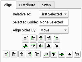 voilĂ : a patch. - the tabs are moved to expandable sections - the comboboxes are now groups of toolbuttons - when the "relative to guide" option is checked, the button pulses when selecting the guide (the coordinates are then in the tooltip) - the icons for the "new" buttons are missing. if martin can't provide them, i can provide a (temporary) set (i'm for slower than him in creating them, but i should be able to come up with something "usable"...). align-and-distribute-into-sections.diff (72,429 bytes)