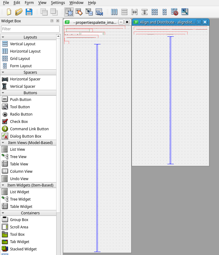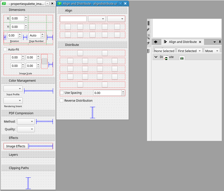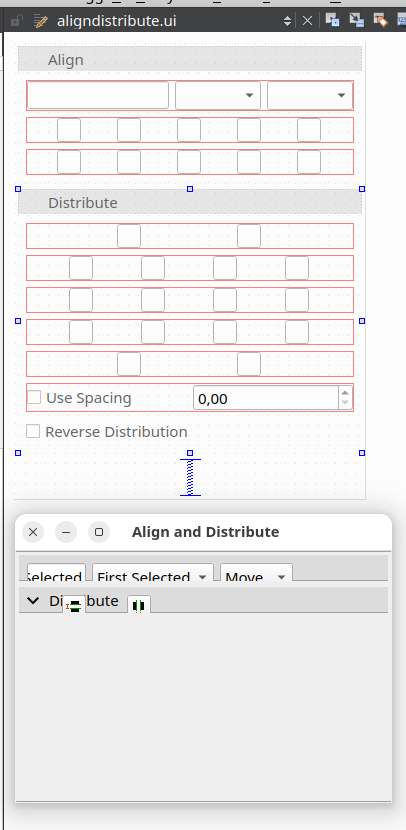 ok, no! i'm for sure missing the plugin! i will install it. we compared the the xml in the .ui and somehow managed to get something to work... the current state is here: https://gitlab.com/a.l.e/scribus/-/tree/align-and-distribute?ref_type=heads but, before you look at it, i need to add the plugin to the qt designer and check if everything is ok in the .ui file. |