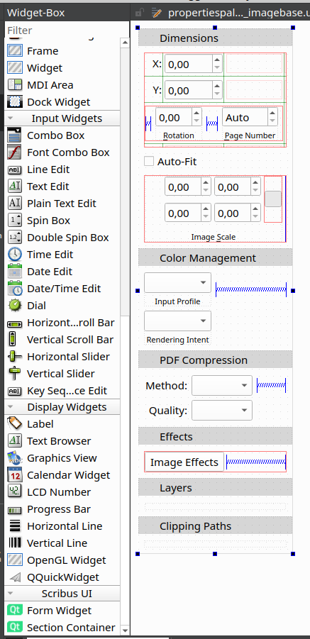 @ale did you compiled the SectionContainer widget as designer plugin? In main folder you can find the ScribusDesignerPlugins.pro file 1. Just compile the project as library 2. copy the library in Qt designer plugin folder. For me, it this path: Qt/Tools/QtCreator/lib/Qt/plugins/designer 3. restart qt designer The used Qt version to compile the plugin should <= the version used to compile Qt designer The plugin contains the SectionContainer Widget and FormWidget. If everything is correct, it should look like this. |