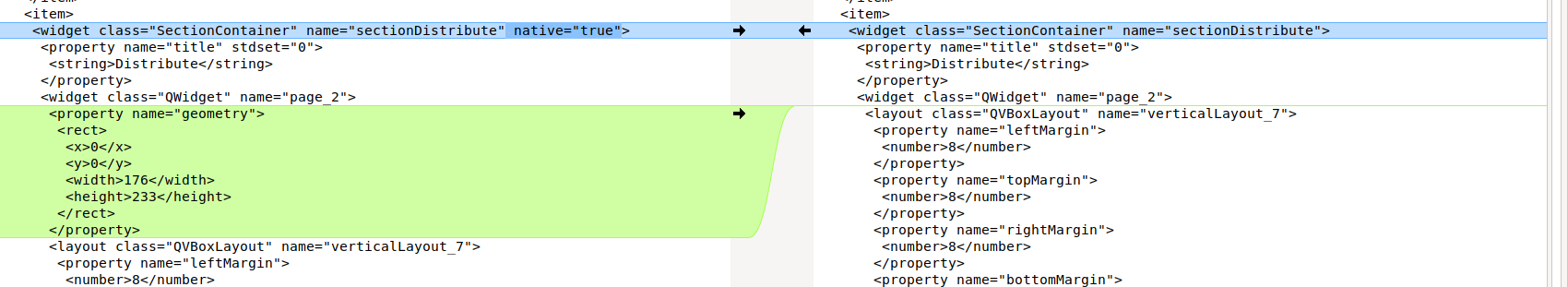 You can try to save the ui file in designer again. Looks like the geometry property of both page widgets occurs the issue. On the left side you can see the file from GitLab, on the right side the file I just saved again in designer without changes. |