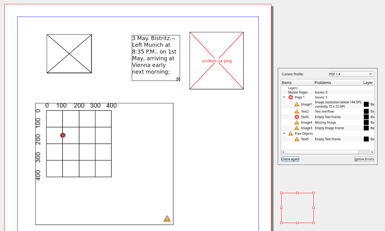 | Description | on canvas, scribus has multiple ways to warn the user about issues with items. on the other side, in the preflight verifier, the warnings are shown in the same way. in a quick try i could find: - empty image frame (no warning canvas, only in the preflight verifier); - an overflowing text frame has a small box in the lower right corner; - an image frame with an invalid link has a big red cross and the file name; - an image with low resolution has a brownish warning triangle in the lower right corner. - item outside of the page - i guess that there is some sort of warning, when displaying a render frame while the current scribus has not "correctly" configure the render frames and/or there is an error when rendering the frame on the other side, an empty text frame has a different icon in the preflight verifier (and no warning on canvas) this having been said: - most of them are shown in the same way in the preflight verifier; - and only the overflowing text frame has a tooltip with more information. i suggest that if if they are the same in the preflight verfiier, then there should also be a uniform warning system on the canvas: - with a way to get more information about the issue (like the tooltip on the overflowing text frame) - it should allow -- in the future -- a way to silence the warning (for a specific item and warning; both on canvas and in the preflight verifier) | ||||