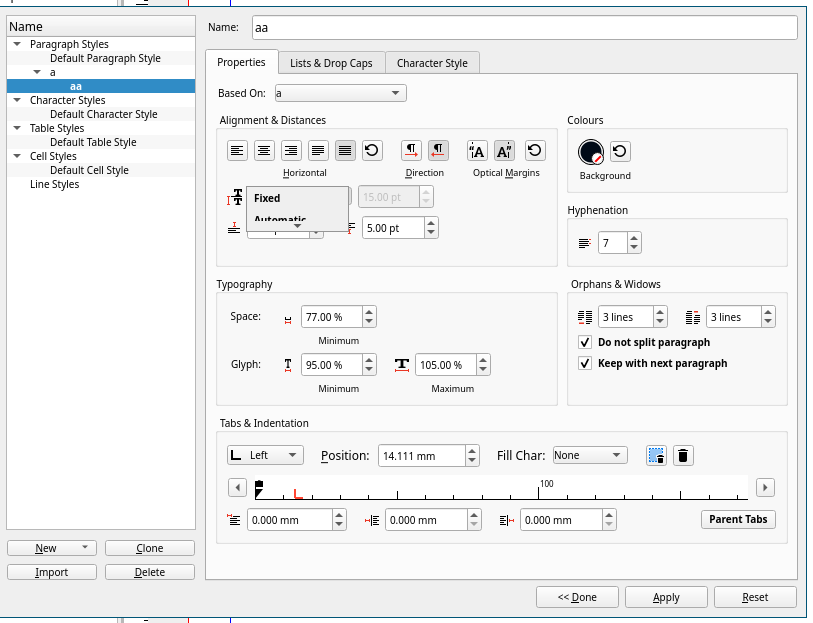 | Steps To Reproduce | - create a "main" style - create a "sub" style - make the "sub" style depend on "main" - make the "main" style have an "automatic" line spacing - the "sub" style _automatically_ gets the "automatic" line spacing - try to set the line spacing of "sub" to "baseline" and it jumps back to "automatic"... | ||||