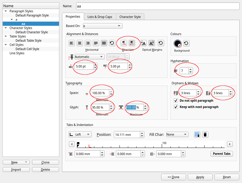 | Description | for styles based on a parent style, many properties can be be reset to the parent value. but not all of them. | ||||