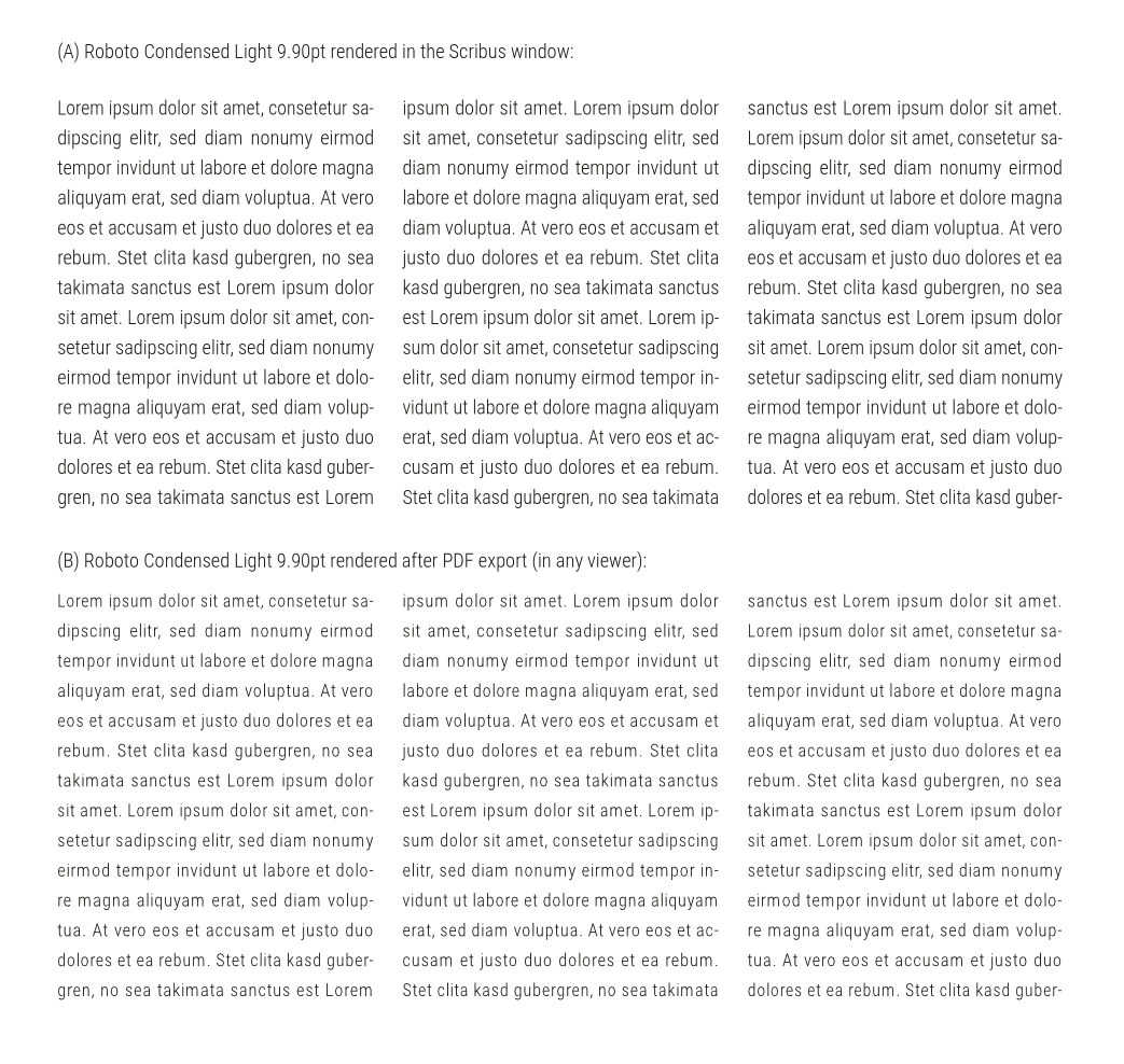 | Description | In version 1.7.1.svn, I noticed a minor rendering discrepancy when exporting documents using non-integer font sizes (e.g., 9.90pt). The exported PDF displays text with slightly smaller letters compared to the Scribus window, while the letter spacing remains consistent. I've attached a comparison image. The issue persists across various PDF viewers. There is one circumstance under which this discrepancy does not occur: when converting the text to paths during export – this resolves the rendering difference. I hope this information helps! | ||||