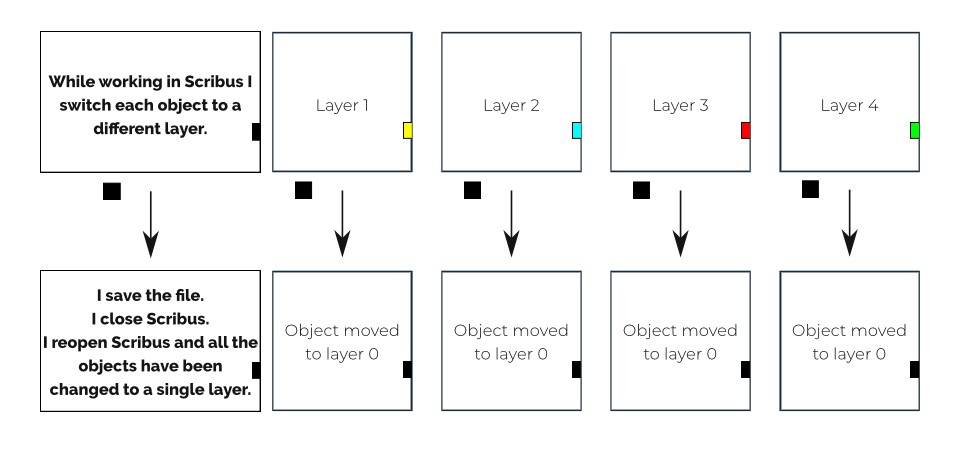 | Steps To Reproduce | - While working in Scribus I switch each object to a different layer. - I save the file. - I close Scribus 1.7.1.svn. - I reopen Scribus and all the objects have been changed to a single layer. | ||||