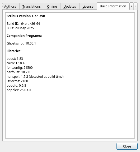 In order to have the Mesh Distortion plugin, Scribus seems to need to be compiled while Boost is around. Can you please check that your Scribus' About dialog has Boost listed under the libraries in the "Build Information"? If it's not the case, you will need to go and ask the people creating the Flatpak to add it. À propos, the Appimage from the CI does not have it either, but libboost-dev should be installed. Any idea what I'm missing? (https://gitlab.com/scribus/scribus-ci-docker/-/blob/main/Dockerfile?ref_type=heads) |