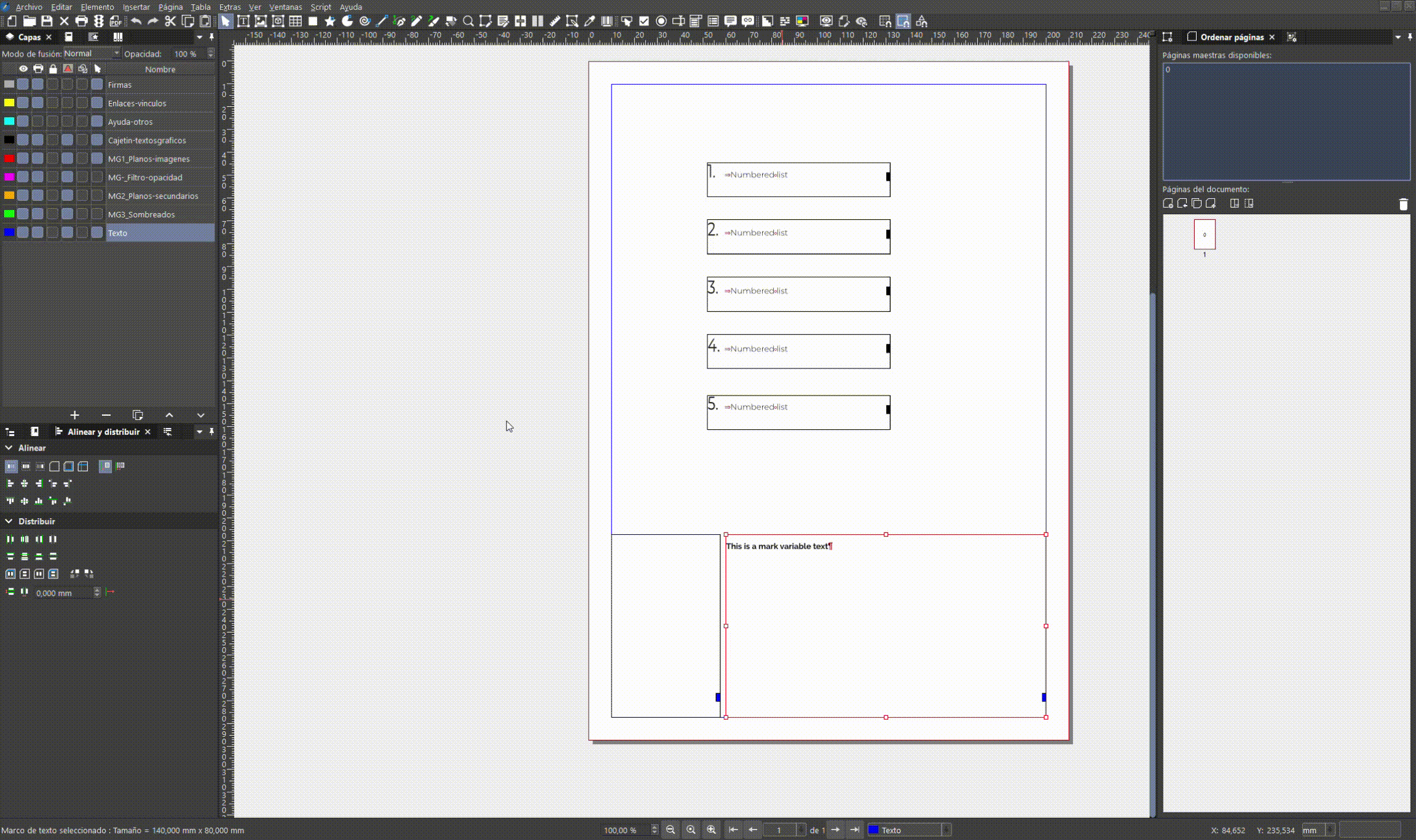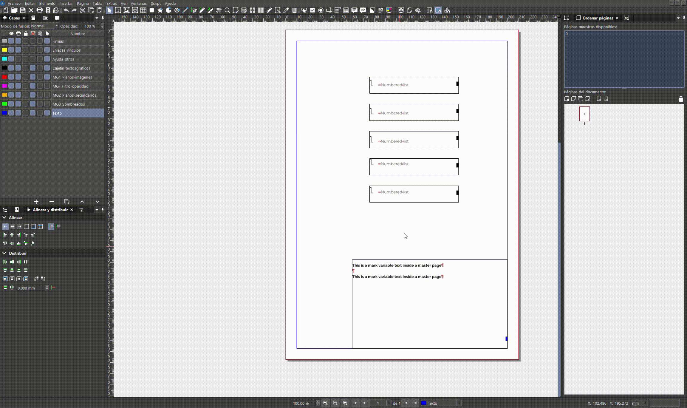 I have performed some more tests: - If the variable text mark is on a normal page, there is no interference with the numbered list. Attached are .sla and .gif files showing the list working correctly (1,2,3...) if the mark is not on a master page. - If the variable text mark is on a master page, the numbered list is corrupted and returns 1,1,1... when closing/opening Scribus. Attached are .sla and .gif files showing the incorrect behavior if the variable text mark is within a master page. During the first changes to the mark, the behavior is correct, but when you save/close/open Scribus, you find that the list has been invalidated (1,1,1, ...). * The numbered list is always on a normal page (not within a master page). 260116_SCRIBUS_List-mark-in-nomal-page_Good-behavior.sla (51,971 bytes)