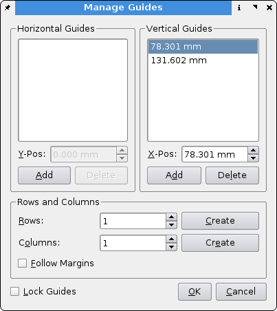 | Description | It is often useful to be able to create guides in the middle of the page, or to make 3 equal columns in the page. So I changed a bit the "guide manager" dialog to allow automatic creation of guides in the page. I include a screenshot, and I have a fully functionnal patch against 1.3 cvs if you are interested. Regards | ||||