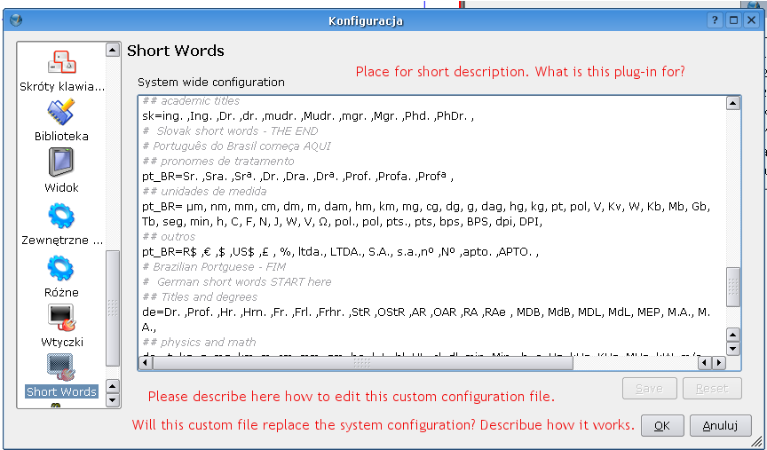 Hi Petr, I like the way you've solved the issue with the Short Words preferences. This remark is not meant for the upcoming 1.3.1 release: Could you add a few words of description to your Short Words prefs dialog (see my attached screen shot). I think it's not obvious enough for new users, what this plug-in is meant for and how to edit the config file. |