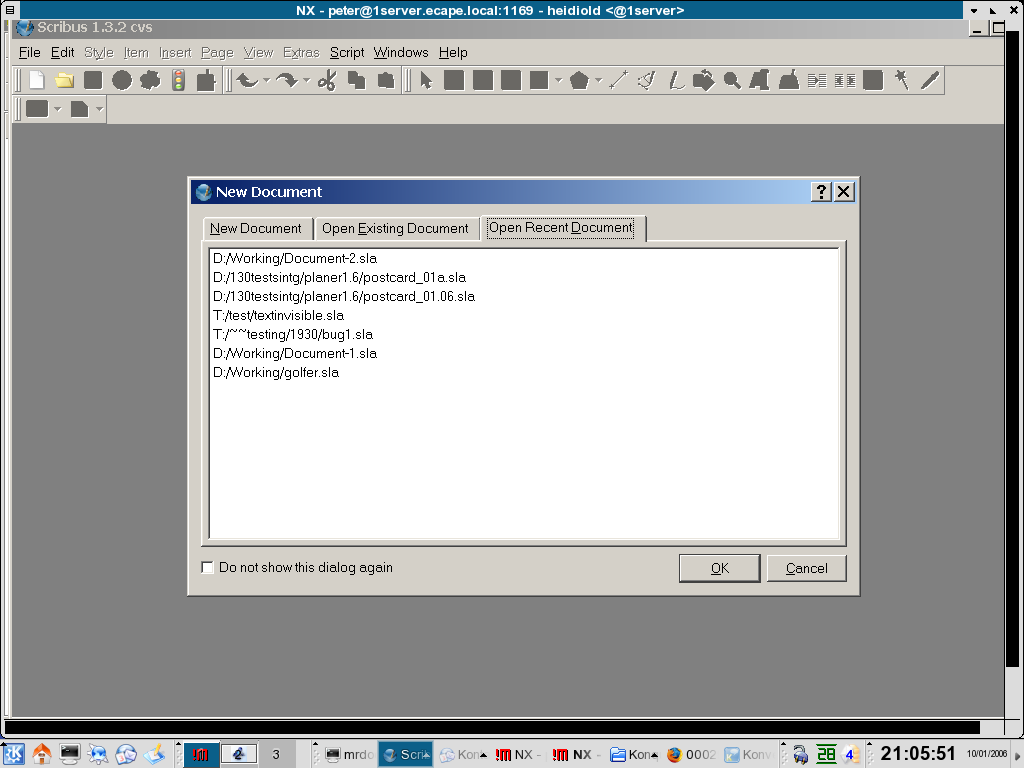 you should reset the recent file list by erasing RECENT elements in scribus13.rc, have seen the same phenomenon, but it disappeared after doing so. |