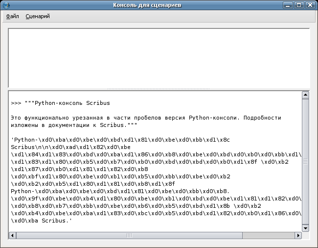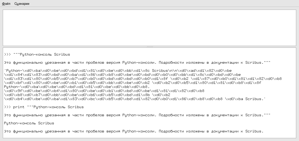 [craig@albert ~]$ python Python 2.4.1 (#1, May 16 2005, 15:19:29) [GCC 4.0.0 20050512 (Red Hat 4.0.0-5)] on linux2 Type "help", "copyright", "credits" or "license" for more information. >>> x = """Python-консоль Scribus ... ... Это функционально урезанная в части пробелов версия Python-консоли. Подробности изложены в документации к Scribus.""" >>> print x Python-консоль Scribus Это функционально урезанная в части пробелов версия Python-консоли. Подробности изложены в документации к Scribus. >>> repr(x) "'Python-\\xd0\\xba\\xd0\\xbe\\xd0\\xbd\\xd1\\x81\\xd0\\xbe\\xd0\\xbb\\xd1\\x8c Scribus\\n\\n\\xd0\\xad\\xd1\\x82\\xd0\\xbe \\xd1\\x84\\xd1\\x83\\xd0\\xbd\\xd0\\xba\\xd1\\x86\\xd0\\xb8\\xd0\\xbe\\xd0\\xbd\\xd0\\xb0\\xd0\\xbb\\xd1\\x8c\\xd0\\xbd\\xd0\\xbe \\xd1\\x83\\xd1\\x80\\xd0\\xb5\\xd0\\xb7\\xd0\\xb0\\xd0\\xbd\\xd0\\xbd\\xd0\\xb0\\xd1\\x8f \\xd0\\xb2 \\xd1\\x87\\xd0\\xb0\\xd1\\x81\\xd1\\x82\\xd0\\xb8 \\xd0\\xbf\\xd1\\x80\\xd0\\xbe\\xd0\\xb1\\xd0\\xb5\\xd0\\xbb\\xd0\\xbe\\xd0\\xb2 \\xd0\\xb2\\xd0\\xb5\\xd1\\x80\\xd1\\x81\\xd0\\xb8\\xd1\\x8f Python-\\xd0\\xba\\xd0\\xbe\\xd0\\xbd\\xd1\\x81\\xd0\\xbe\\xd0\\xbb\\xd0\\xb8. \\xd0\\x9f\\xd0\\xbe\\xd0\\xb4\\xd1\\x80\\xd0\\xbe\\xd0\\xb1\\xd0\\xbd\\xd0\\xbe\\xd1\\x81\\xd1\\x82\\xd0\\xb8 \\xd0\\xb8\\xd0\\xb7\\xd0\\xbb\\xd0\\xbe\\xd0\\xb6\\xd0\\xb5\\xd0\\xbd\\xd1\\x8b \\xd0\\xb2 \\xd0\\xb4\\xd0\\xbe\\xd0\\xba\\xd1\\x83\\xd0\\xbc\\xd0\\xb5\\xd0\\xbd\\xd1\\x82\\xd0\\xb0\\xd1\\x86\\xd0\\xb8\\xd0\\xb8 \\xd0\\xba Scribus.'" >>> x 'Python-\xd0\xba\xd0\xbe\xd0\xbd\xd1\x81\xd0\xbe\xd0\xbb\xd1\x8c Scribus\n\n\xd0\xad\xd1\x82\xd0\xbe \xd1\x84\xd1\x83\xd0\xbd\xd0\xba\xd1\x86\xd0\xb8\xd0\xbe\xd0\xbd\xd0\xb0\xd0\xbb\xd1\x8c\xd0\xbd\xd0\xbe \xd1\x83\xd1\x80\xd0\xb5\xd0\xb7\xd0\xb0\xd0\xbd\xd0\xbd\xd0\xb0\xd1\x8f \xd0\xb2 \xd1\x87\xd0\xb0\xd1\x81\xd1\x82\xd0\xb8 \xd0\xbf\xd1\x80\xd0\xbe\xd0\xb1\xd0\xb5\xd0\xbb\xd0\xbe\xd0\xb2 \xd0\xb2\xd0\xb5\xd1\x80\xd1\x81\xd0\xb8\xd1\x8f Python-\xd0\xba\xd0\xbe\xd0\xbd\xd1\x81\xd0\xbe\xd0\xbb\xd0\xb8. \xd0\x9f\xd0\xbe\xd0\xb4\xd1\x80\xd0\xbe\xd0\xb1\xd0\xbd\xd0\xbe\xd1\x81\xd1\x82\xd0\xb8 \xd0\xb8\xd0\xb7\xd0\xbb\xd0\xbe\xd0\xb6\xd0\xb5\xd0\xbd\xd1\x8b \xd0\xb2 \xd0\xb4\xd0\xbe\xd0\xba\xd1\x83\xd0\xbc\xd0\xb5\xd0\xbd\xd1\x82\xd0\xb0\xd1\x86\xd0\xb8\xd0\xb8 \xd0\xba Scribus.' >>> | ||||