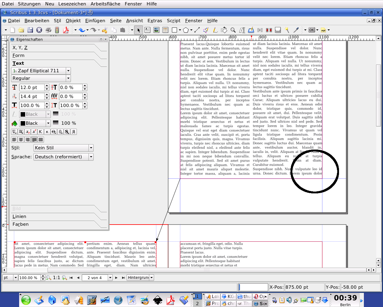 Another observation: On an almost regular basis, the last lines on a page are not justified if this is chosen in the PP. _But_ if I justify the text in the next connected frame too, the lines in the first one are aligned as expected. See screenshots. |