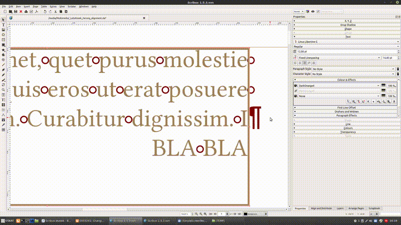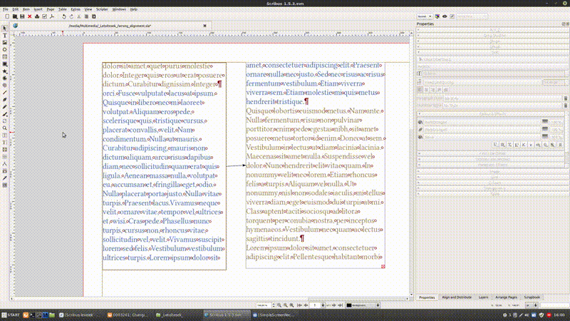 <quote>Another observation: On an almost regular basis, the last lines on a page are not justified if this is chosen in the PP. _But_ if I justify the text in the next connected frame too, the lines in the first one are aligned as expected. See screenshots.</quote> I get the same result as Christoph in 1.3.3.6: the last line of a linked frame gets the alignment of the next frame. Doesn't seem to be by paragraph. I think the issue is more general, though. Look at wrong_alignment.sla. By deleting lines from the middle of the first frame, I got two alignments in one frame (didn't know you could do that :). But although the centering (according to the file) actually starts with the word "dictum", the line before it gets centered as well. That must be the underlying problem, which is triggered by justifying two linked frames differently. I don't know about any of the other issues reported. |