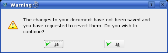 Its the same issue, look at the code: int t = QMessageBox::warning(this, QObject::tr("Warning"), "<qt>" + QObject::tr("The changes to your document have not been saved and you have requested to revert them. Do you wish to continue?") + "</qt>", QMessageBox::No | QMessageBox::Default, QMessageBox::Yes); if (t == QMessageBox::No) return; Works here perfectly, however sorry, I mistyped the duplicate bug. |