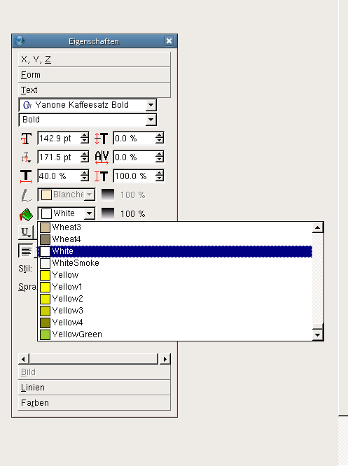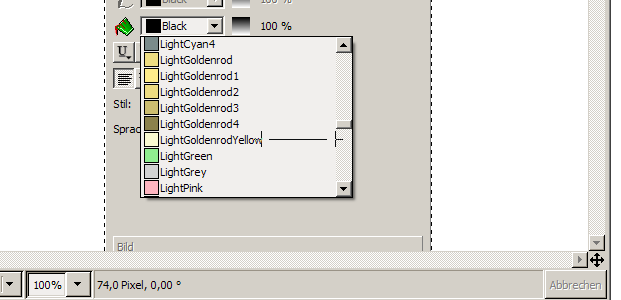 | Description | The drop down list for text colour in the properties palette shows the same behaviour as it did in 1.2.4.1: the list is drawn to the right end of the screen, and it is impossible to move up and downwards unless a wheel mouse is used. See screen shot. | ||||