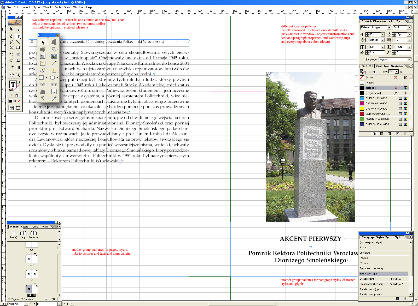 version 4 was also quite good. but let's back to the subject. i really understand that scribus has not to be a quark (or any other app) clone. here i talk about separate pallettes and - generally - interface. quark's interface is just example. to say the truth, indesign's one is in many parts much better. for me (and i think that for many people using dtp apps like quarkxpress, indesign or pagemaker) current scribus' pallettes are hard to use - just too much integrated, and lot of clicking is neccessary, some options are hidden too deep. i just gave some ideas: separate pallettes (qxp, ind), pallettes grouping (ind), context menus for pallettes (for adding, modifing, duplicating, deleting styles, colours, pages or anything else), property bar - that's my favourite (qxp). i think, that implementing these ideas, could make scribus better, and more user-friendly |