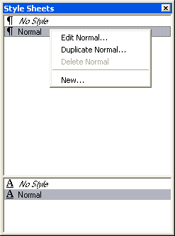 we both are talking about different things ;) i thought about context menu for separate pallete (for paragraph and character styles for example - like in qxp) - you right click on style name in pallette, and you may use one of function enabled: "add new style", "add new style based on selected", "modify", "delete" and so on... my general idea (as i wrote it to maciej) is make scribus interface similiar to qxp's one (like it was in the beginning) - it is really good for me. but: de gustibus non disputandum est. it is just my opinion. maybe because i was working with qxp lot of years |
