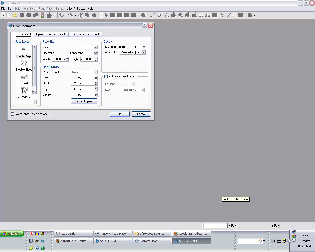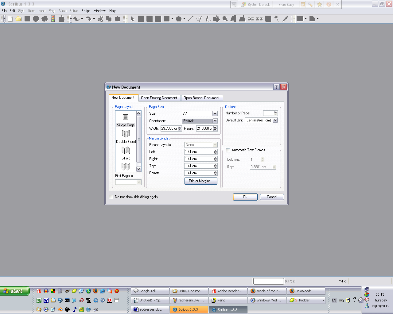 I can't reproduce this issue. Is there any chance you can provide an exact series of steps, from launching Scribus to clicking the new document button, that will let me test out what's happening? You might also want to get rid of your preferences file in case something odd has happened there - it should be in c:\documents and settings\yourname\.scribus . Move that to your desktop and see if that resolves the issue. If it doesn't, the steps to reproduce described above, plus a screenshot of the new file dialog (create it using ALT-PrintScreen then paste the screenshot into MS Paint and upload to this bug tracker) would be handy. |