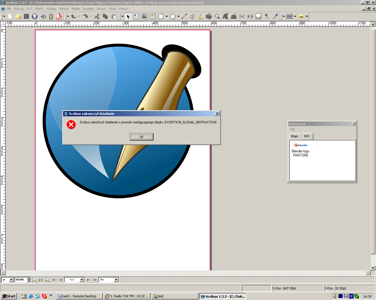 confirming. Opening svg leads even to a crash on scribus1.3.3/win32 (see the attached screen shot). Opening the same SVG image with File/Import works OK. |