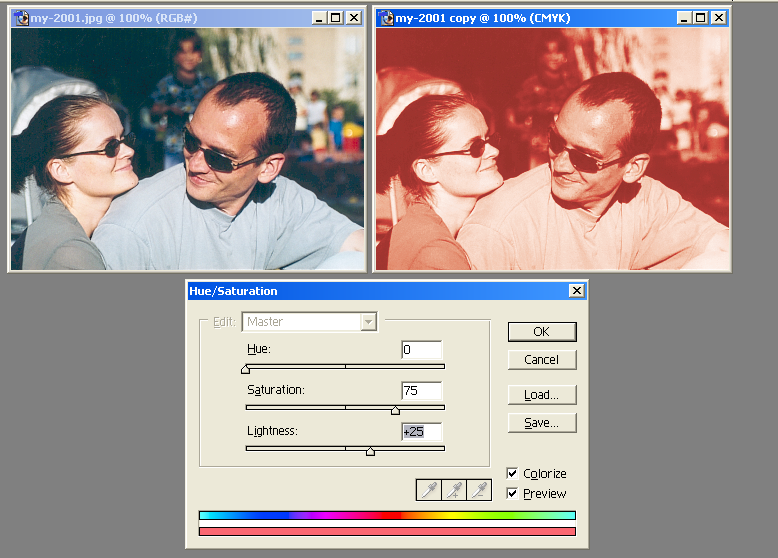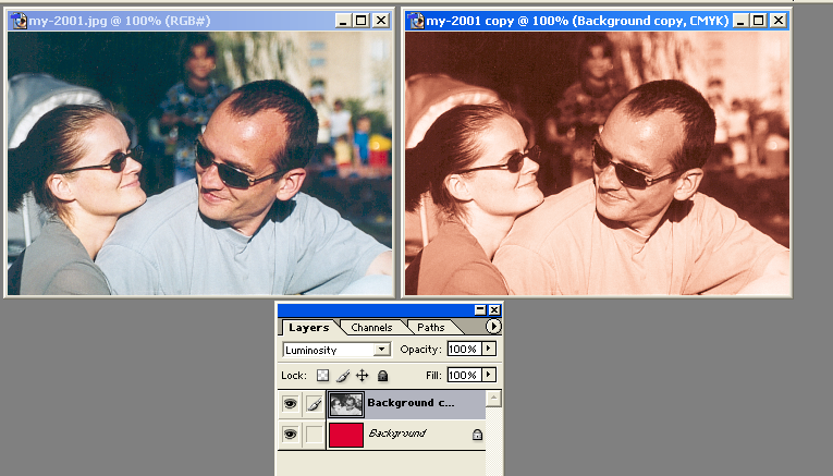 DCS? what for? ok, i will try to describe my idea better. we have any grayscale bitmap (in examples i have converted colour bitmap, but with grayscale result would be the same), and we want to make it red (c0m100y100k0) for example. in both cases scribus should treat/interprete grayscale bitmap as cmyk - and print it as cmyk also. 1. scribus converts any value of black (0-255 or 0-100%) to value of red (c0m0y0k0-c0m100y100k0); for example 128 (50%) black should be c0m50y50k0 (50% red) - see 'pic_red.png'. this is simple case. 2. there is more difficult graphical filter neccessary. i don't know the filter in gimp, but in photoshop you may do this using hsb values with 'colorize' option on - see 'colorize_pic_1.png', or use two layers: first with main picture, second filled with the solid color (red), and the first layer have to be blended using luminocity - see 'colorize_pic_2'.png (both methods have different results of course). |
