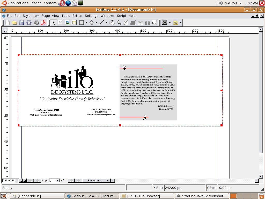 PLINNEL22 is a CS2.psd file. After reading your statement below what is your conservative suggestion about importing already window created graphic files into scribus if asked? Where ILO deploys linux & scribus this will not be an issue because the files will be freshly created within linux. Wondering if the same will happen in a Macintosh environment because we work with MACs as well. We are just installing ubuntu on the MAC. Do any of these issues exist in Red Hat, Centos or Mandrake? |