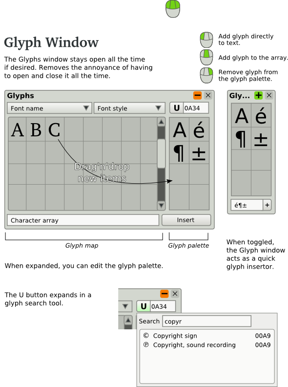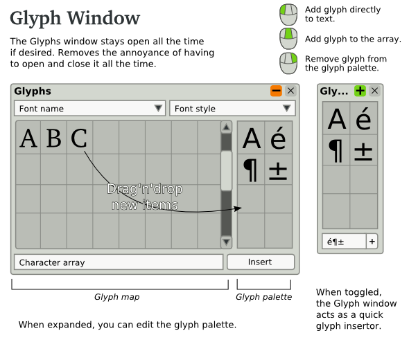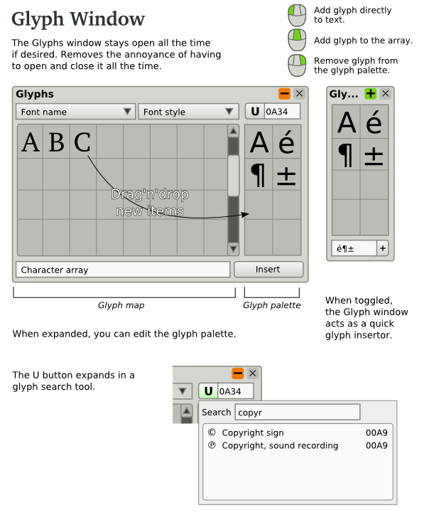 | Description | Sometimes, when authoring a book, users need to use standalone letters from many alphabets multiple times. The way it can be done in Scribus right now, is either opening "Insert character" dialog over and over again, or copy/paste from other parts of text. In my GNOME desktop I have a very useful applet "Character palette" that I use on regular basis to add good typographic quotes and emdash to my texts. It would be great to have its analog inside Scribus. Here is a small functional specification. 1. Character palette in Scribus should contain a customizable set of glyphs on per-document basis with possibility to share sets of characters/glyphs between documents. 2. Adding a new glyph to palette should be done from "Insert character" dialog, by selecting a glyph and clicking "Add to character palette" dialog. "Insert character" dialog should be available from Character palette. 3. Removing a glyph from palette should be done via context menu for each glyph. 4. Single click on a glyph in Character palette copies it to clipboard. 5. Each glyph can optionally have its own character style. If it doesn't have one, it inherits style from the part of the text it's added to. 6. Each glyph has a hint, where font face and unicode value are displayed. If character style is defined, then font size and other style settings should be displayed as well. Optional feature: multiple palettes in Character palette (GNOME applet has it). | ||||