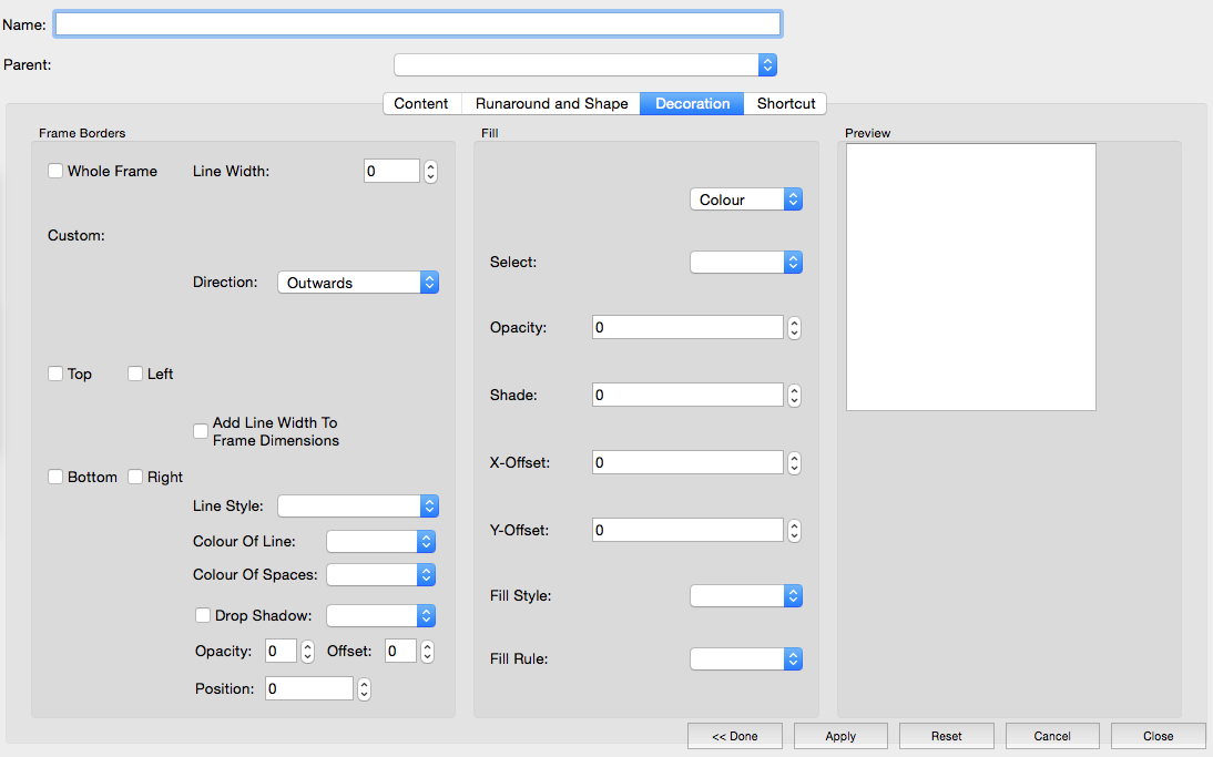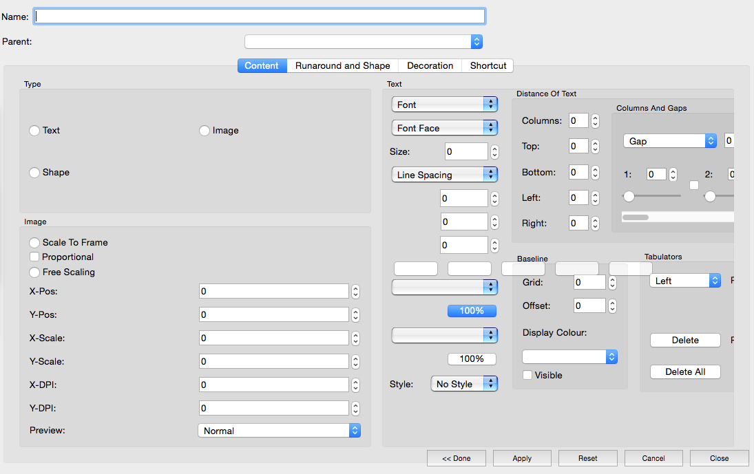 | Description | Next mockup: Frame styles. Description: Four Tabs; no. 4 is shortcuts, thus no reason to explain it here. The rest uses features from the PP and the setup dialogs, but also adds some new suggestions. Tab 1, "Content", It uses basic features for images and texts from the PP and also adds the currently separate "tabulators" dialog. It also contains a suggested more flexible way to edit columns/gaps as discussed in 162. It takes also into consideration rfe 518 that required individual baselines for frames. Tab 2, "Shape And Runaround", includes the current shape tab, but the suggestion is to integrate "Edit Shape" here as well (minus edit contour lines). The "Runaround" box includes 3 new rfes (AFAICT): Runaround based on alpha channels and on a selected colour (e.g. white). It'd also be possible to use only the outside of an image or to let the text flow in transparent spaces inside. The dialog would also allow to define the distance of runaround for left, right, top, and bottom separately. Tab 3, "Decoration", contains the frame decoration and the fill. What's new is that the frame border could be edited similar to cells in a table (see 4621). The user could also choose to move the line width of the frame to the outside, inside or both. He could even add the new line width to the frame dimensions. | ||||