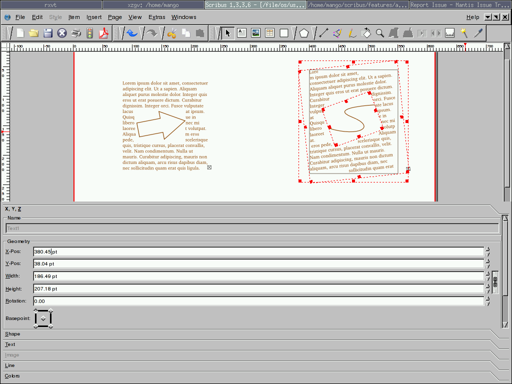 | Description | The "reference angle" of a frame determines the orientation of its bounding box and the angle of text flow for text frames. It could be nice to change this angle or reset it to that of the page without changing the physical appearance of the frame on the canvas.