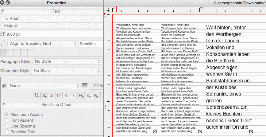 | Description | Sometimes text gets written on every second baseline (middle frame in sample). So far I do not know what the exact trigger is. Maybe one needs to define the minimum line spacing? What about something like "align to baseline grid: every 1st/2nd/3rd baseline"? | ||||