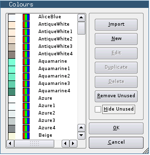 and what about an option: "show used colors" ... i mostly work with the provided list of colors, but i only need the full list at the beginning of the work and when i want to choose a new color. (so "remove unused" is not an option... but hide unused is one :-) a button "show/hide unused" under the "remove unused" one in the color dialog could do it for me. i fear i could also try to implement it, if the devs agree that this is an interesting feature... |