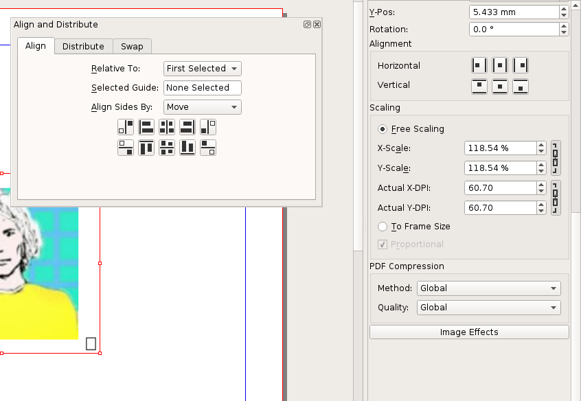 When I load the scribus splashscreen into an image frame, it doesn't center vertically and doesnt go to the bottom of the frame either. Center horizontal mightbe ok, but right horizontall is again off. Typo in Horizontal in GUI. There's issues with the selection of Default. I assume it should return the image to the top left but it doesn't. Also, I think the controls might need to be nearer to the X/Y position to understand that it just updates those values. Also, the case where an image has been scaled needs to be handled properly, by using the scaled width. Thanks for the patch, let's see how the next revision is. |