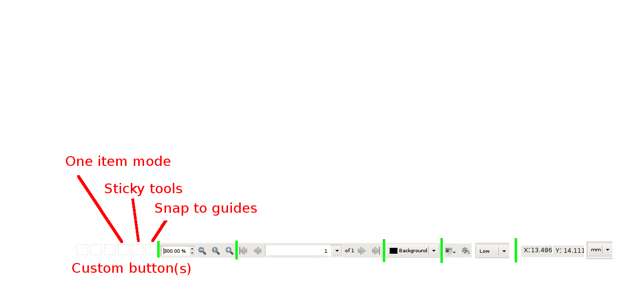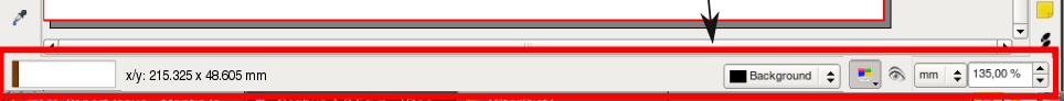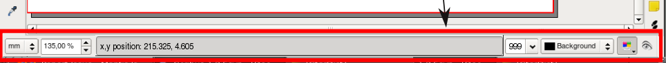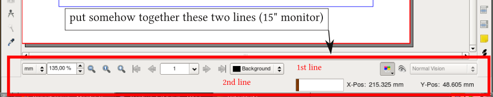 editing the screenshot in the gimp, my went to the gimp's status bar, and since gimp is well known for its progressive user interface (well, i'm on the side of the ones who likes it!), i've developed further my proposal (with a new screenshot: * on the left side unit and zoom like in the gimp * in the middle the message bar with the mouse position when nothing else is shown * the progress bar is shown over the whole message bar * on the right side first the page number, then layer and further general input and, at the end, all the small icons for specific tasks and now? what you think about it? |