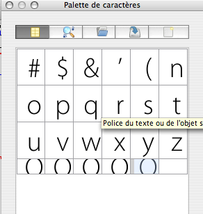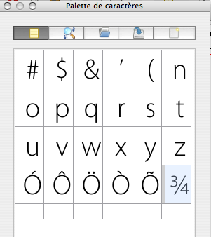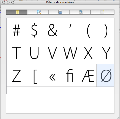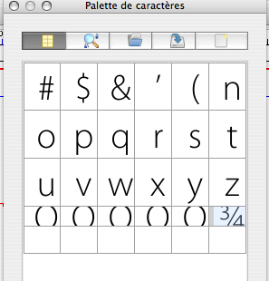 | Additional Information | This dialog could benefit from a "clear all" button and/or a similar option in the contextual menu. Also, I think that being able to select the glyphs we don’t need anymore by ctrl-clicking (which would allow to make a selection of non-contiguous glyphs in the palette) or by dragging around the glyphs or by shift-clicking to make a selection of contiguous glyphs, would be nice. At least for testing and filing this bug report, it would have saved a bit of time! :) | ||||