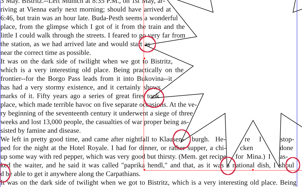 | Steps To Reproduce | Text flow around complex shapes doesn't work (see screenshot): 1) some letters and also automatic hyphens are _in_ the shape, not outside of it. 2) the shape moves parts of a word to the next line, without hyphenating. | ||||