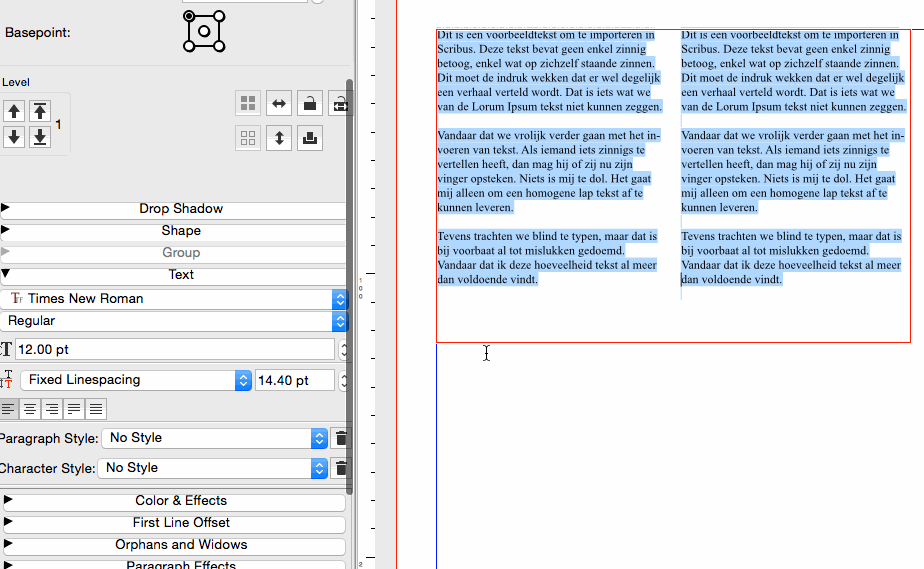 | Description | When you have a text block with 2 columns, and apply a column break in the first column and then apply a paragraph style to both columns, the first paragraph in the second column seems to be skipped. This happens in the stable release and the 1.3.5svn on Windows | ||||