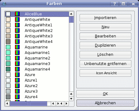 | Description | Show the color palettes like in GIMP with no names for color atlases. The Palette Editor in GIMP http://docs.gimp.org/en/gimp-concepts-palettes.html http://docs.gimp.org/en/images/dialogs/palette-editor.png Color Atlases http://gimpstuff.org/content/show.php/Color+Palettes%2BAtlas%2BHarmony?content=86119 | ||||