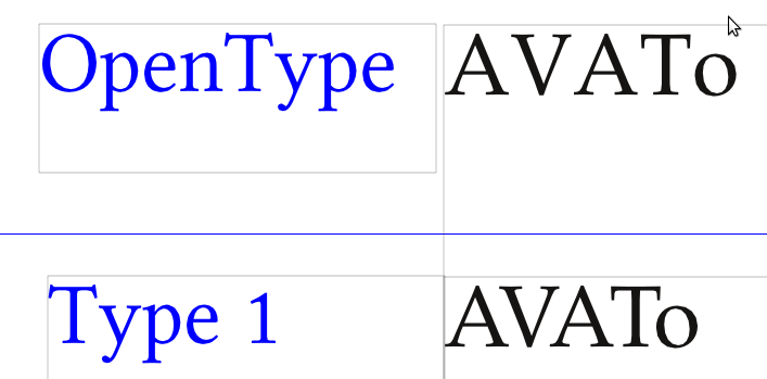 | Steps To Reproduce | Download e.g. pagella font, write AV and To and use OpenType and Type 1. Type 1 has nice kerning whereas OpenType doesn't any. Pagella font: http://www.gust.org.pl/projects/e-foundry/tex-gyre/pagella | ||||
