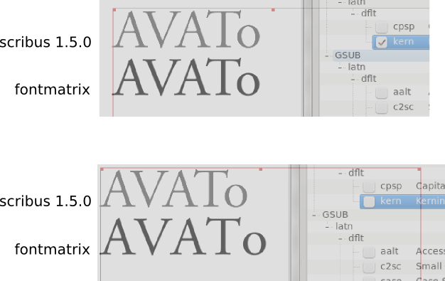 Dear Pierre, thank you, but: I've tried on Windows (!) with Scribus 1.3.6, 1.3.7 and 1.3.8 – kerning definitely does not work there when using OpenType-fonts while it works well with TrueType- ans PS-fonts. So, sorry if I ask again: The "issue details" only talk about "Platform: Linux" and 1.5.0 as targeted version (while cbradney says there's a patch in version 1.3.6). => Is there a solution for the Windows-version, too? |