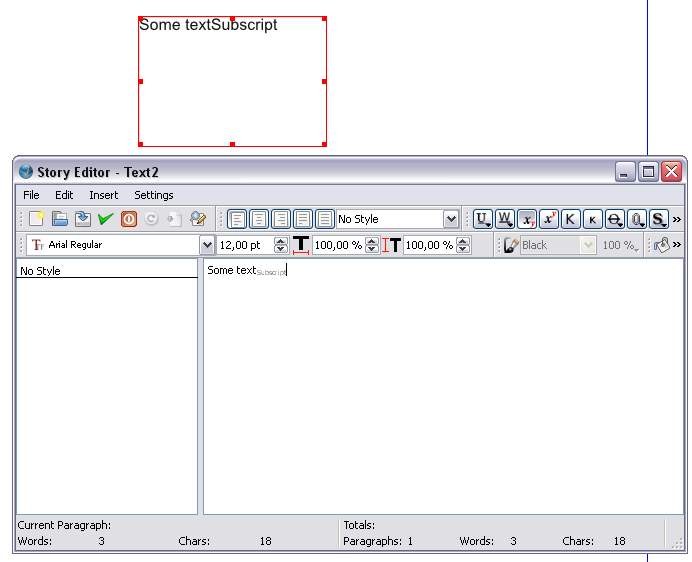 | Description | When I type some text in the story editor window, press the button "Subscript" and go on typing, the following text in the story editor window is presented in subscript (as you would expect). If I now press the button "Update text frame", ALL the text in the text frame is shown in normal height (see snapshot). If I know change the focus from story editor window to programm window and back again, the subscript text is presented in normal height. | ||||