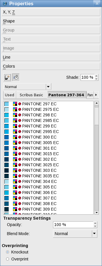 | Description | This is a feature request. The scenario is e.g. the following: a designer shows a business card layout to a customer and they sit down to a nicely calibrated display in order to test how the chosen Pantones look on a live layout (those that can be approximated in RGB, at least), as opposed to square swatches in a printed book -- perhaps to change the choice. Now, spot colors (or any other colors) can be imported into document's colors from a file, but it would be easier to operate them if they were accessible as separate swatches/palettes through the PP, under the Colors section, e.g. in tabs. I imagine people would just drop palette files in /usr/lib/scribus/swatches, possibly dozens of them, then a configuration entry would allow them to restrict the default palettes to just a few, then document proprties entry would allow them to override the default for a specific document. I attach a mock-up of what it might look like. | ||||