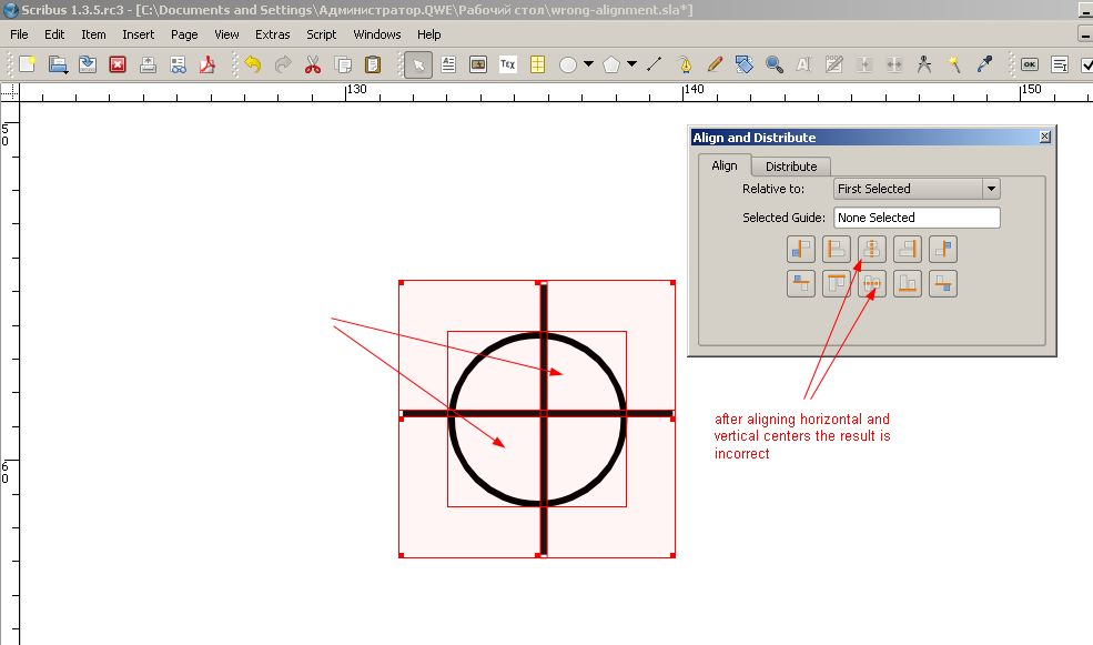 | Steps To Reproduce | 1. open attached sla 2. zoom to 1000% to see enlarged objects 3. select all 4. select menu Window/Align and distribute. 5. click the 2 icons shown in attached jpg 6. see the result: the circle is divided by horizontal and vertical lines NOT at its center. tested on 1.3.5rc3, and on 1.5.0svn (linux fedora) - both give wrong result. | ||||